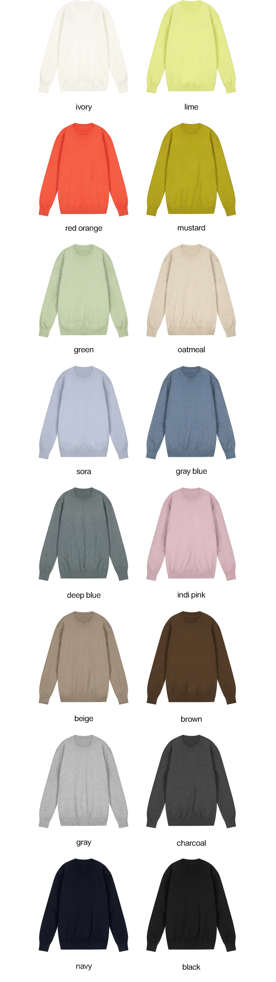 | 색상 | 아이보리, 블랙, 오트밀, 베이지, 브라운, 그레이, 차콜, 라임, 딥블루, 그레이블루, 레드오렌지, 머스타드, 인디핑크, 소라, 그린, 네이비 |