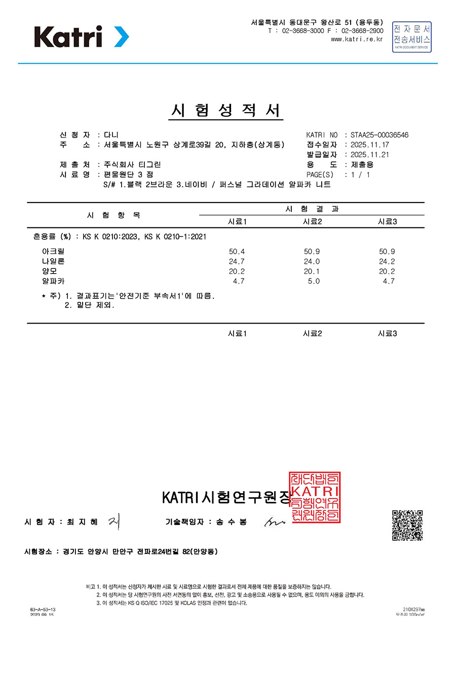 | 소재 | 블랙 : 아크릴 50.4% 나일론 24.7%, 울 20.2%, 알파카 4.7% 브라운 : 아크릴 50.9% 나일론 24%, 울 20.1%, 알파카 5% 네이비 : 아크릴 50.9% 나일론 24.2%, 울 20.2%, 알파카 4.7% |