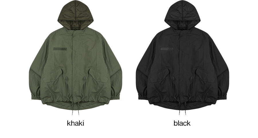 ⦁ 후드 부분까지 이어진 안감은 버튼으로 간편하게 조절할 수 있습니다 밑단 스트링을 활용하여 벌룬핏 실루엣