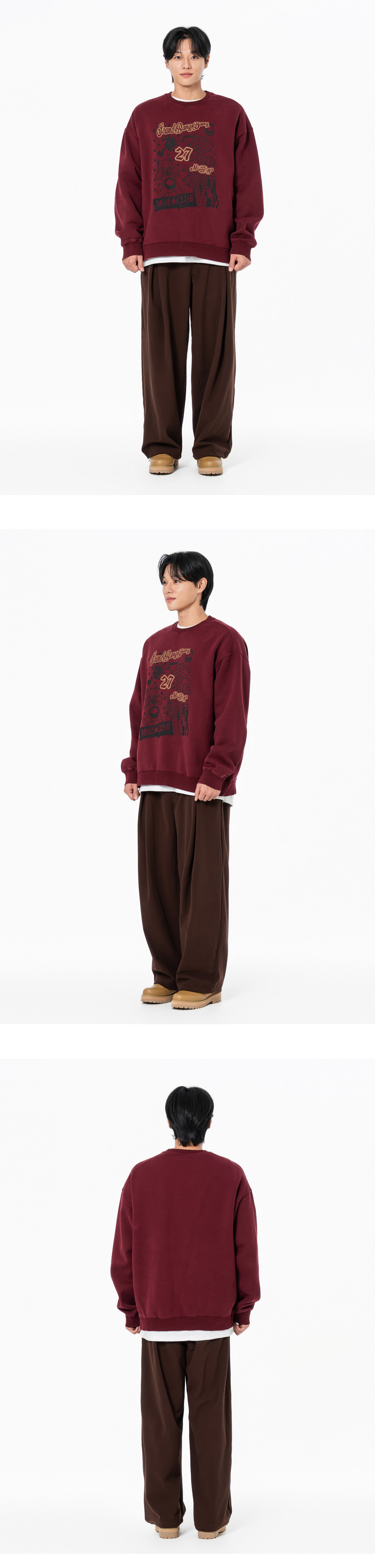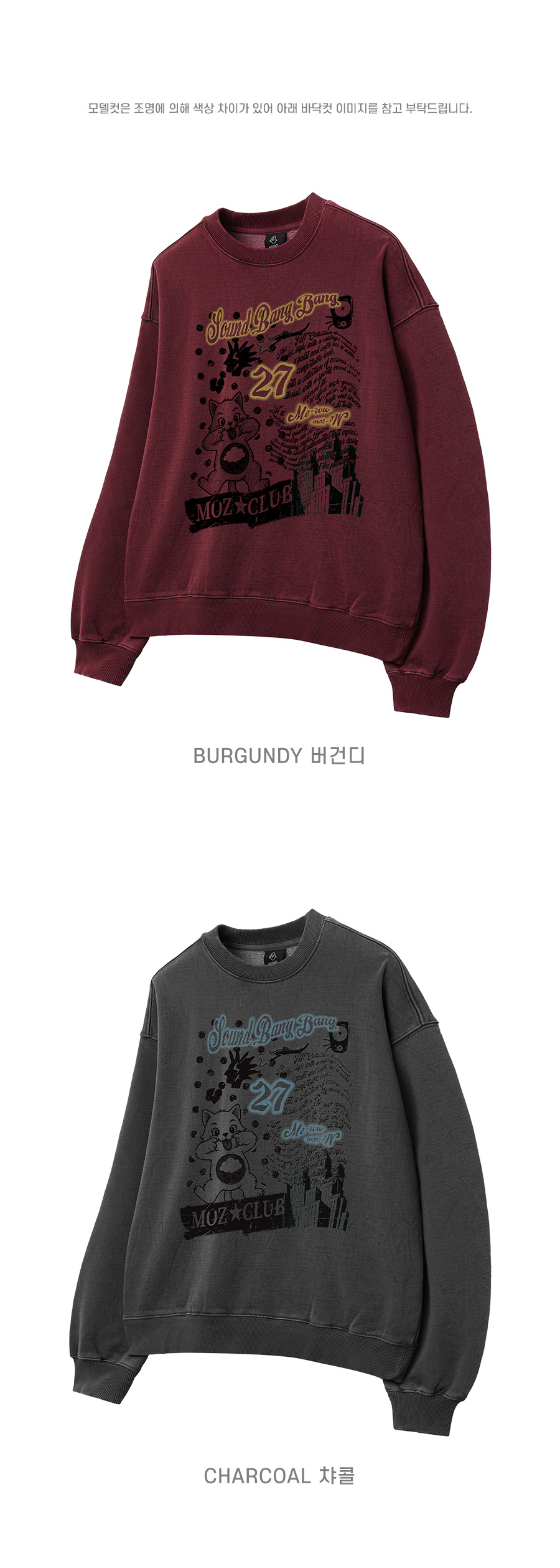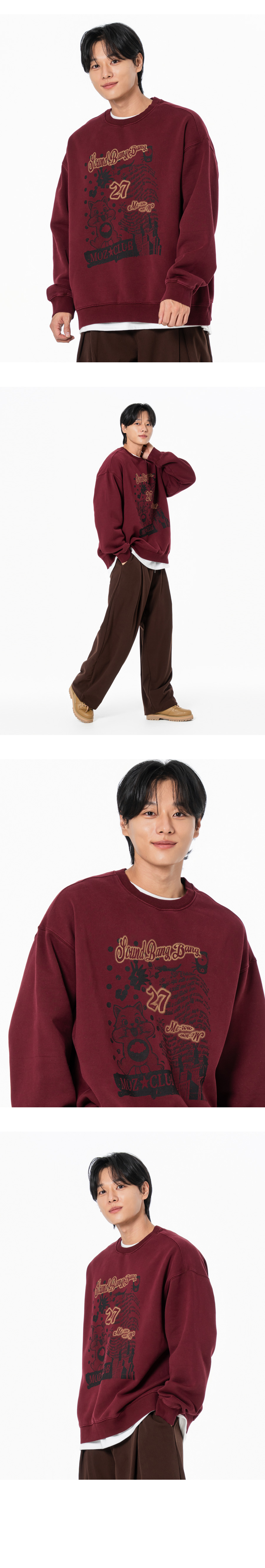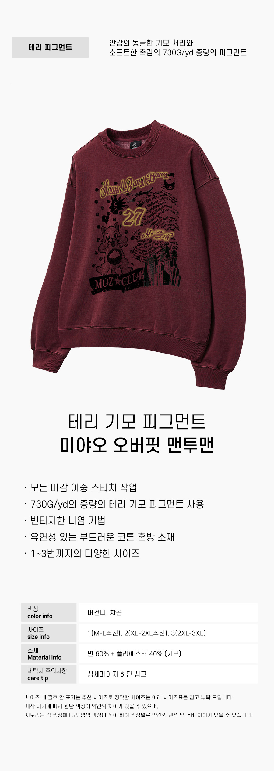 미야오 테리 기모 피그먼트 오버핏 맨투맨 버건디