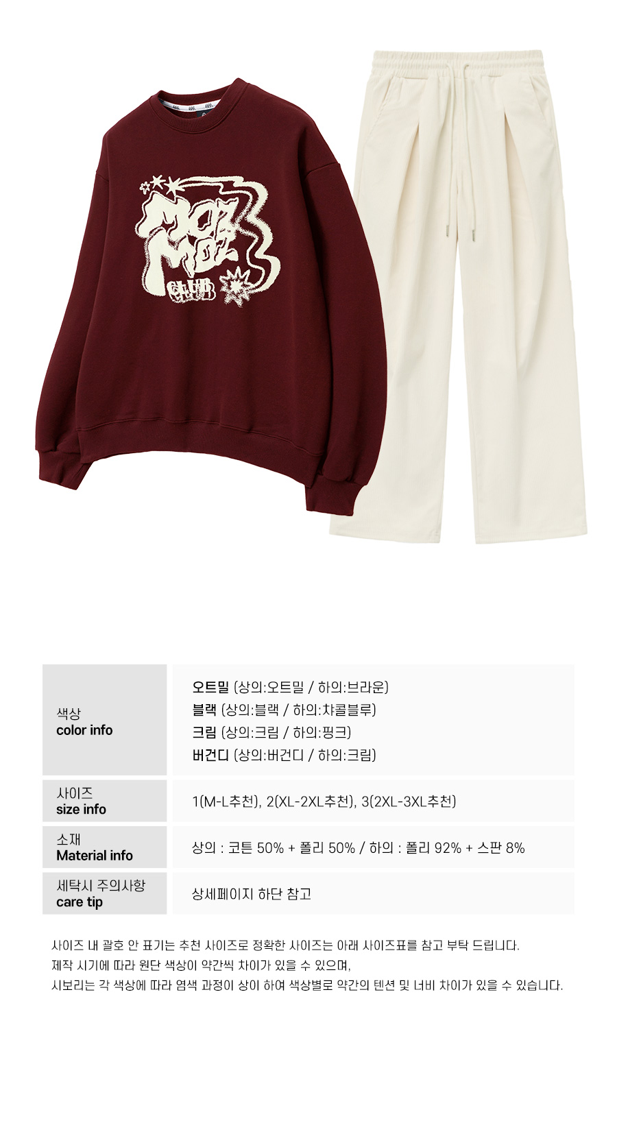[SET] 트윙클 오버핏 맨투맨 + 코듀로이 원턱 와이드 팬츠 버건디