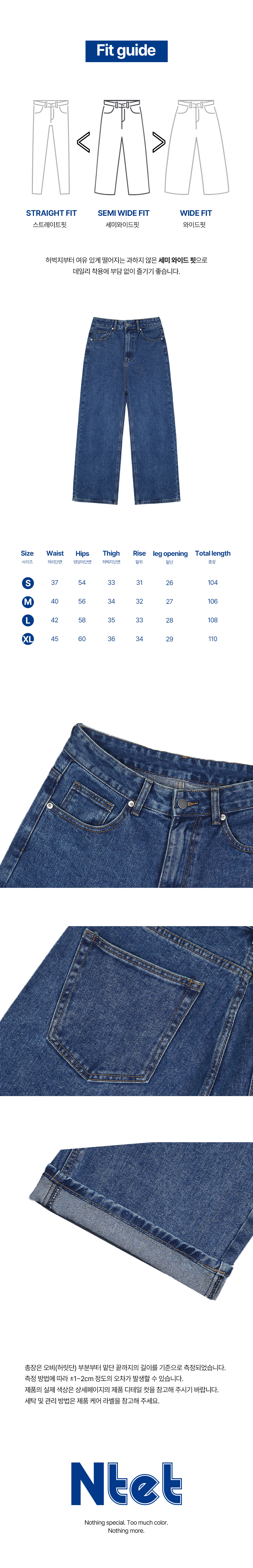 | 허리둘레 | 힙둘레 | 허벅지둘레 | 밑위 | 밑단둘레 | 총길이 | |