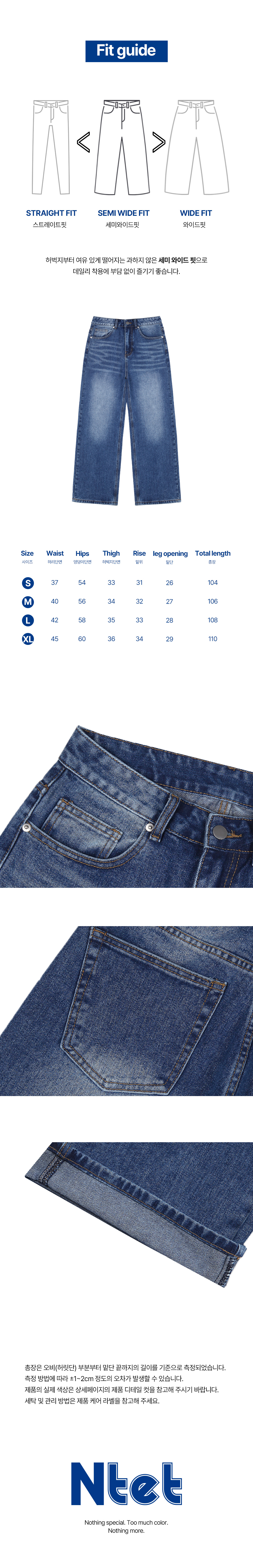 | 허리둘레 | 힙둘레 | 허벅지둘레 | 밑위 | 밑단둘레 | 총길이 | |