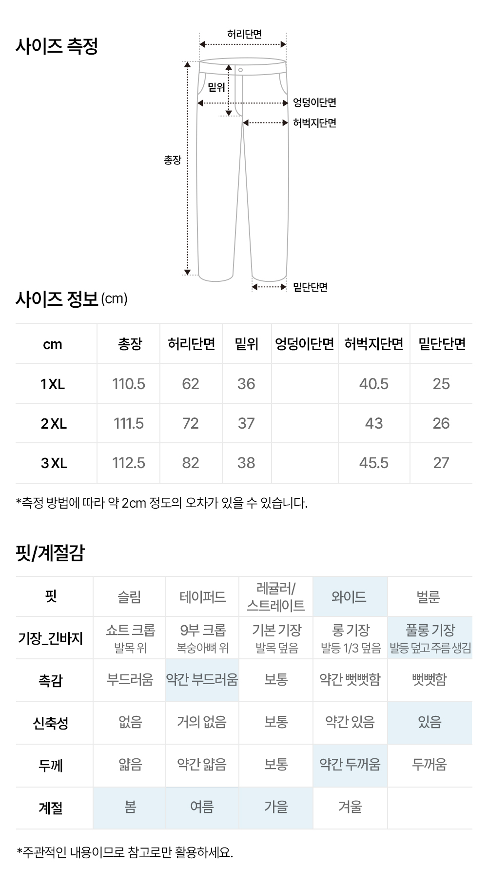 | 허리둘레 | 힙둘레 | 허벅지둘레 | 밑위 | 밑단둘레 | 총길이 | |