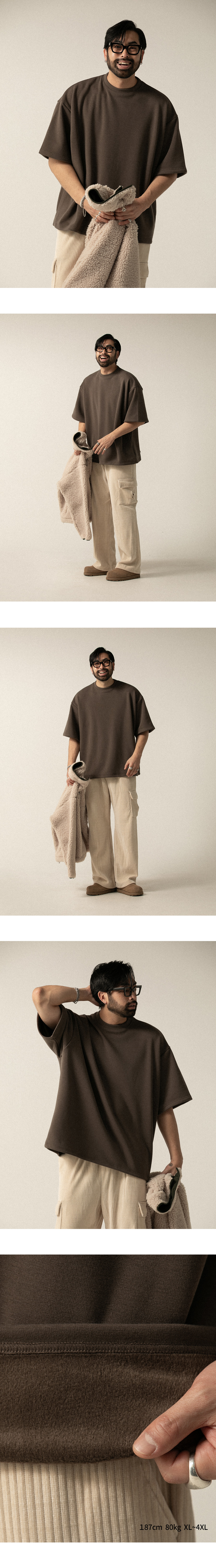 ⦁ 부드러운 텍스처와 뛰어난 보온성을 갖춘 양기모 안감의 라운드 반팔 티셔츠입니다
