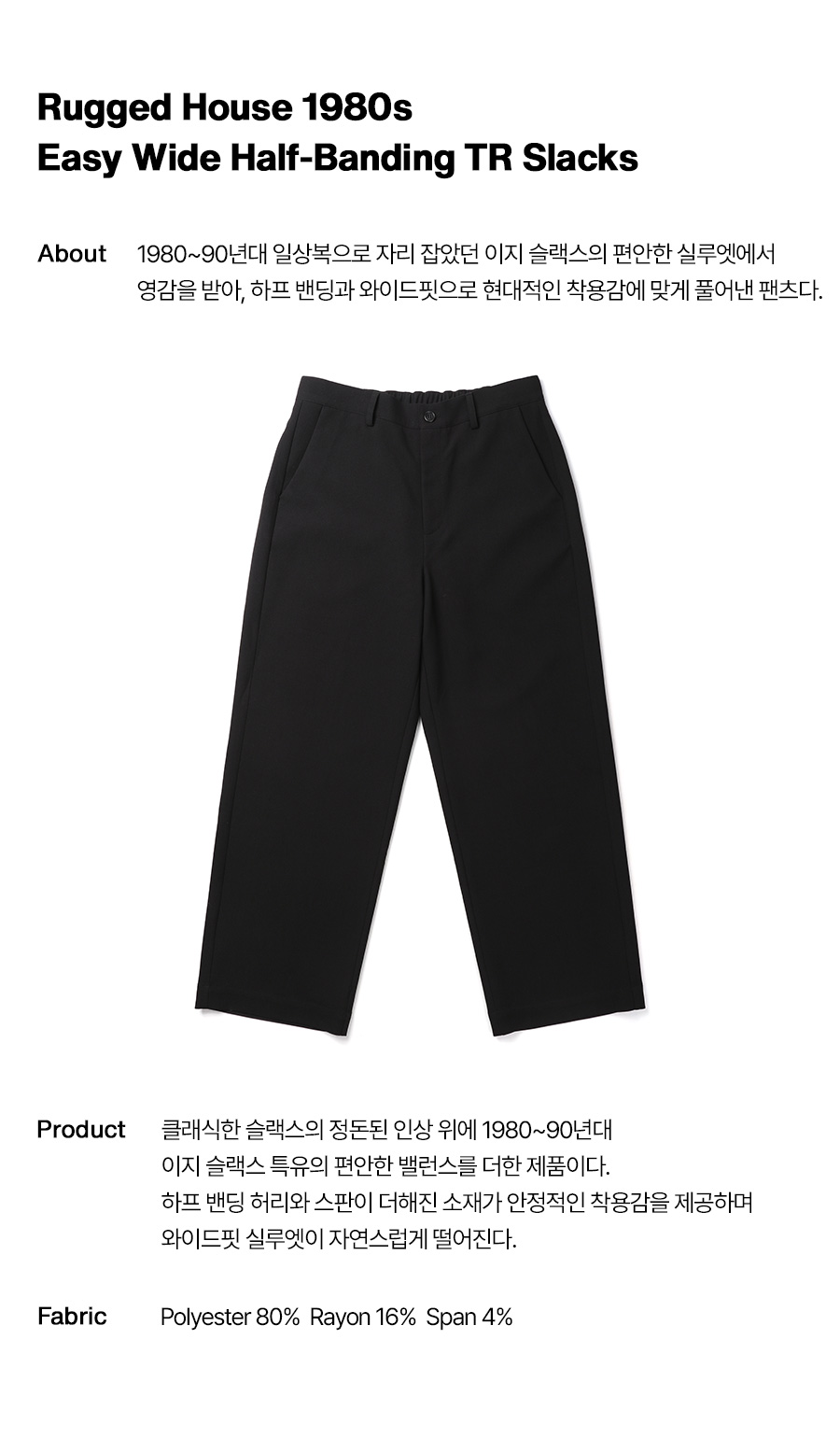 ⦁ 1980~90년대 이지 슬랙스의 여유로운 실루엣에서 영감을 받은 하프 밴딩 와이드 TR 슬랙스.