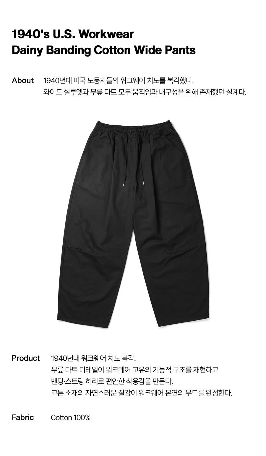 ⦁ 1940년대 미국 노동자들의 워크웨어 치노를 현대적으로 복각한 와이드 코튼 팬츠.