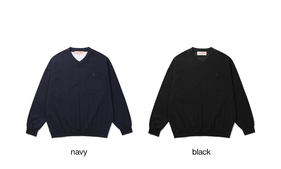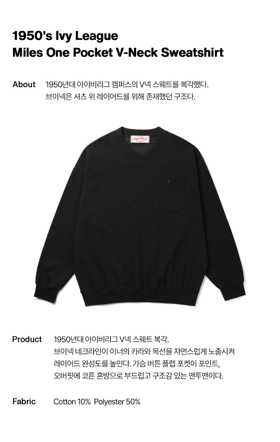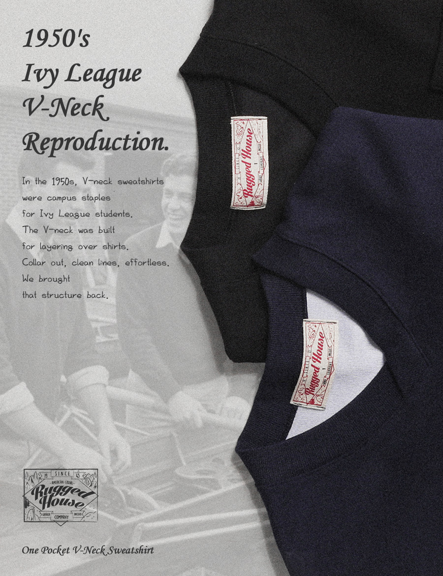⦁ 1950년대 미국 아이비리그 캠퍼스의 V넥 스웨트셔츠를 현대적으로 복각한 원포켓 브이넥 맨투맨.
