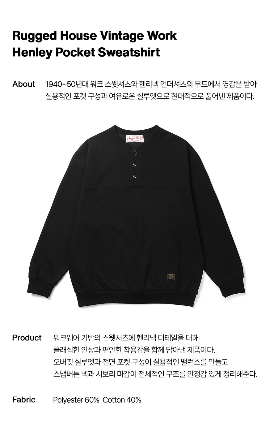 ⦁ 1940~50년대 워크웨어 기반 스웻셔츠와 헨리넥 언더셔츠의 무드에서 영감을 받은 헨리넥 버튼 포켓 맨투맨.