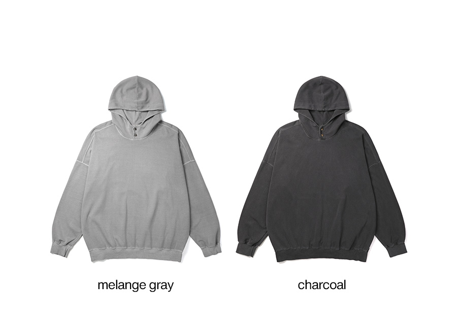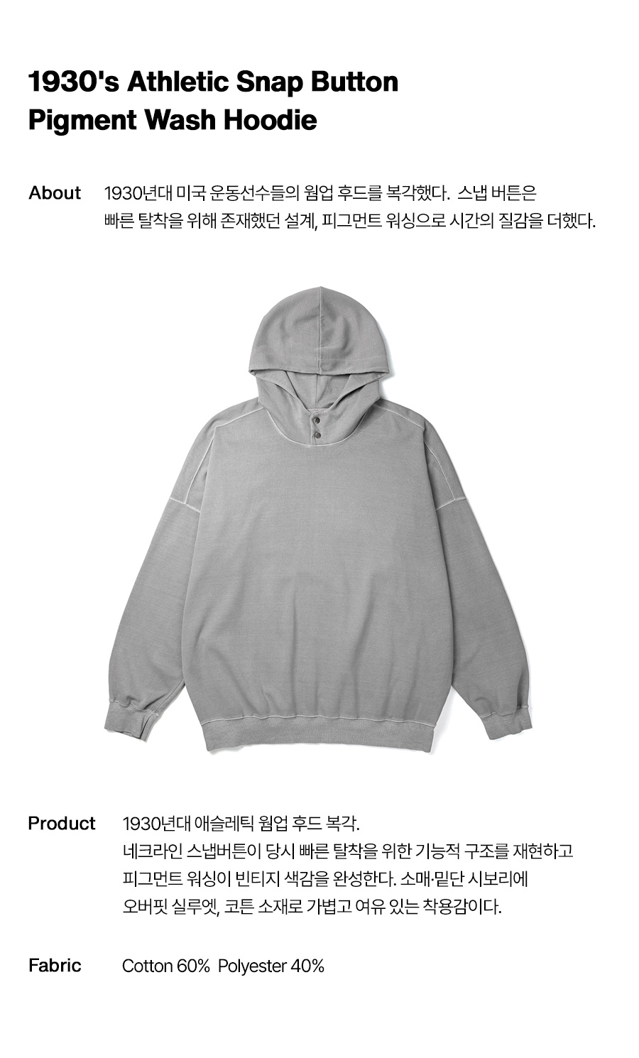 ⦁ 1930년대 미국 운동선수들의 애슬레틱 웜업 후드를 현대적으로 복각한 스냅버튼 피그먼트 후드티.