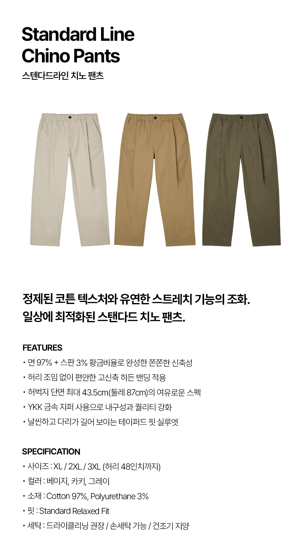 ⦁ 3% 스판 혼방과 고신축 밴딩으로 편안한 빅사이즈 치노팬츠.