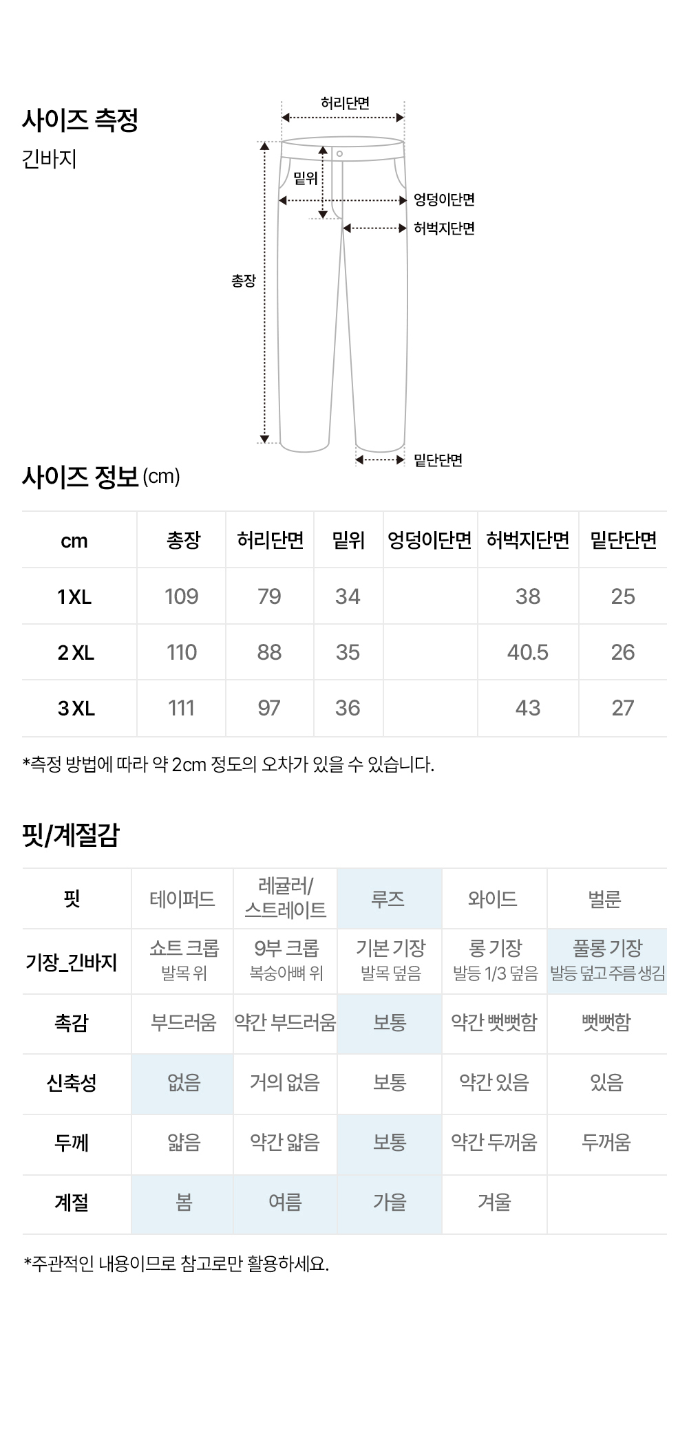 | 허리둘레 | 힙둘레 | 허벅지둘레 | 밑위 | 밑단둘레 | 총길이 | |