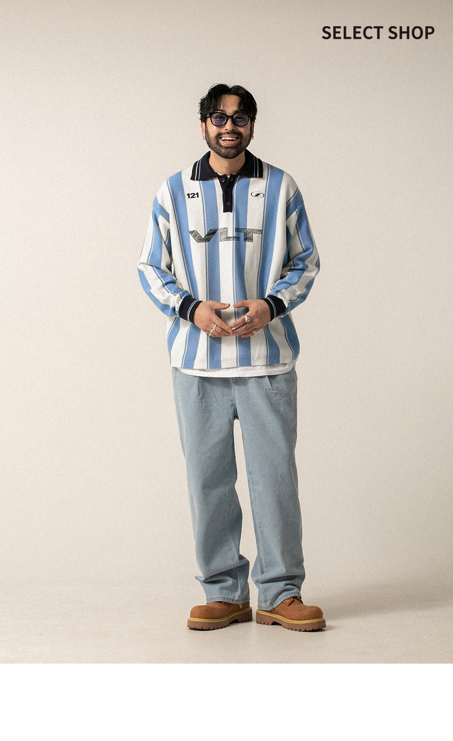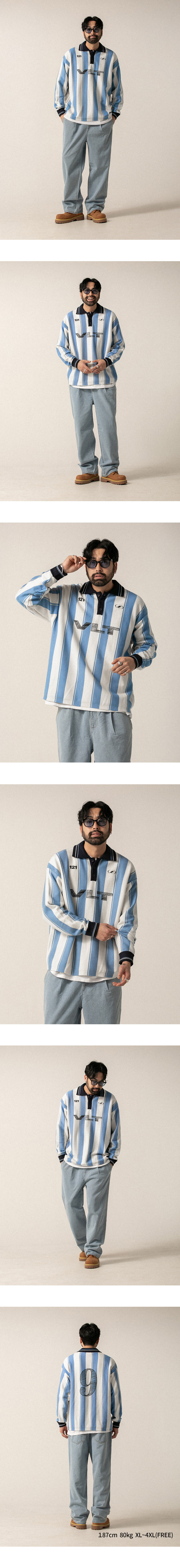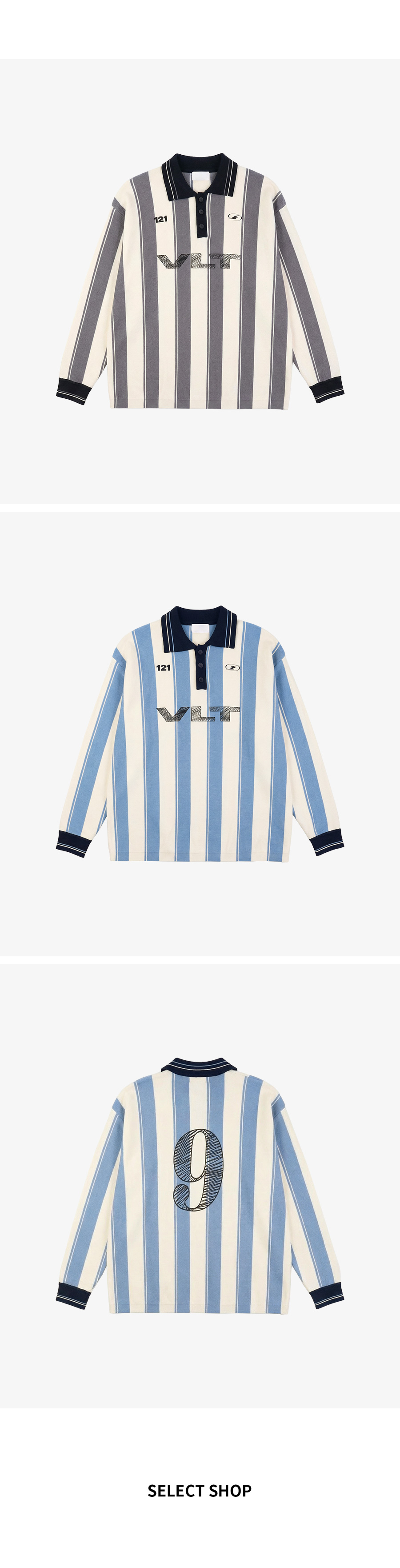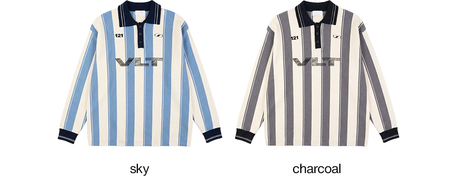 ⦁ 세로 스트라이프 패턴으로 깔끔한 포인트를 준 롱슬리브 카라티입니다