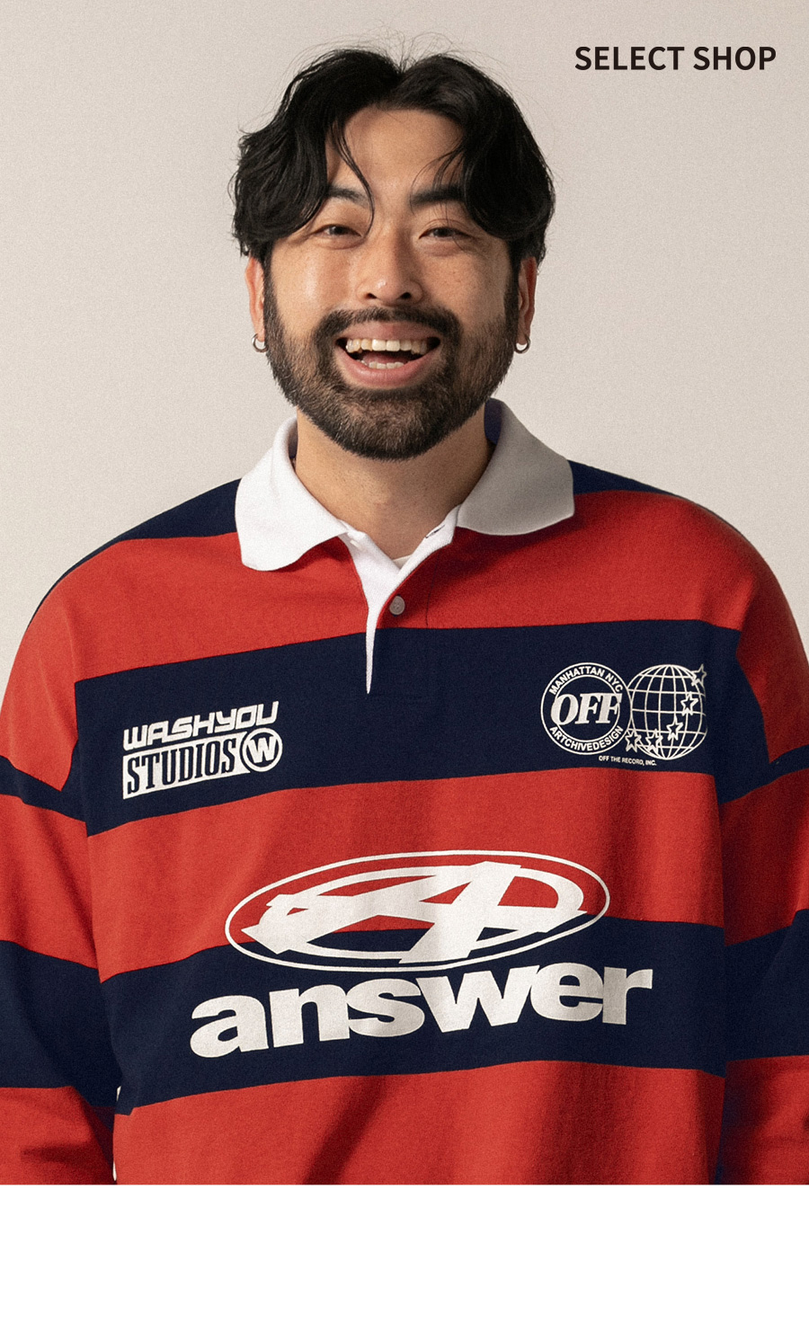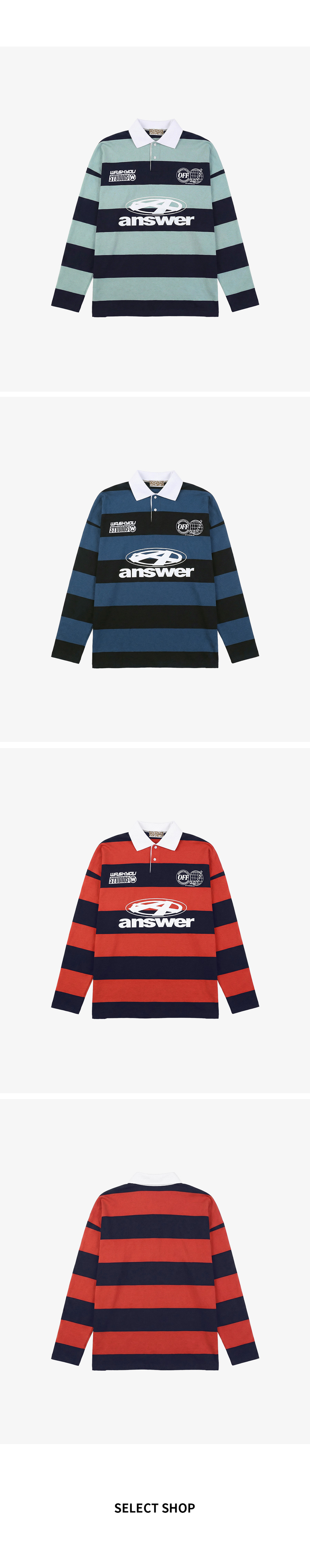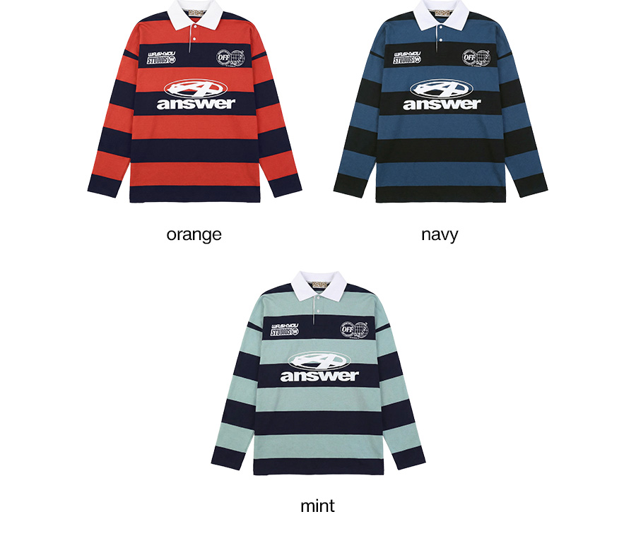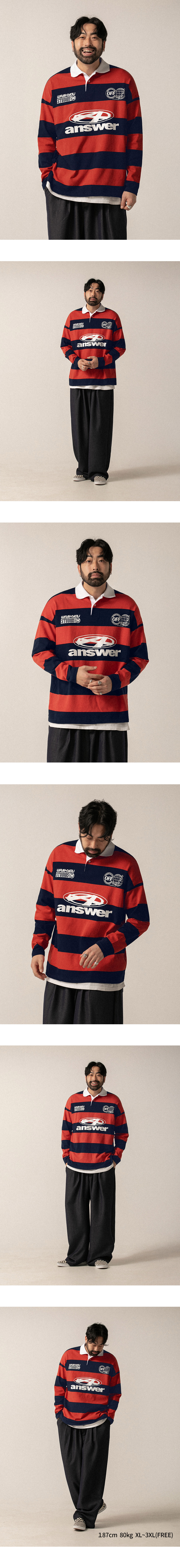 ⦁ 굵은 스트라이프 패턴으로 존재감 있는 분위기를 만든 럭비 카라티입니다