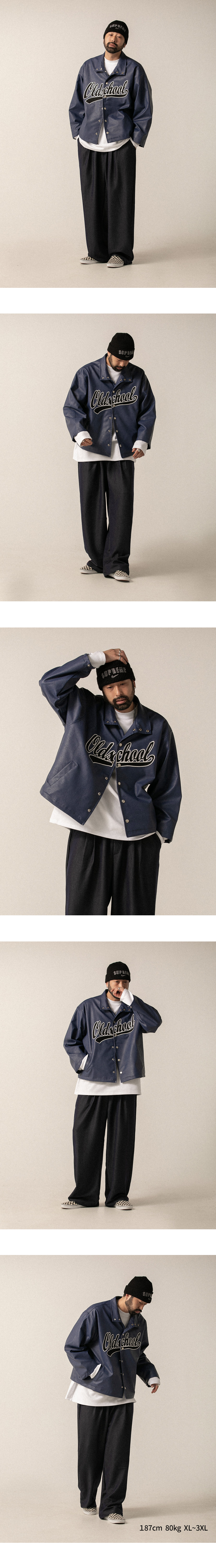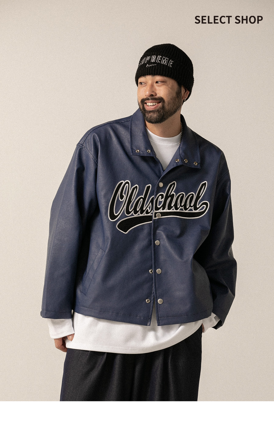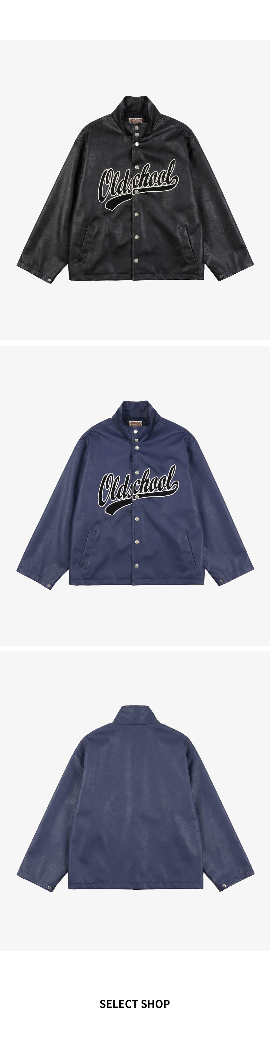 ⦁ 가슴에 크게 배치된 'Oldschool' 레터링 자수가 빈티지한 무드를 연출하는 인조가죽 자켓입니다.