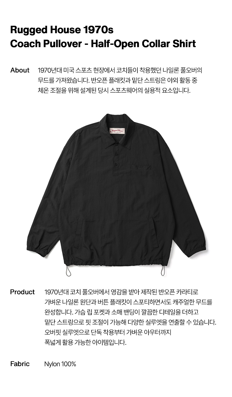 ⦁ 1970년대 미국 스포츠 코치들이 착용했던 풀오버 셔츠에서 영감을 받은 반오픈 카라티입니다.