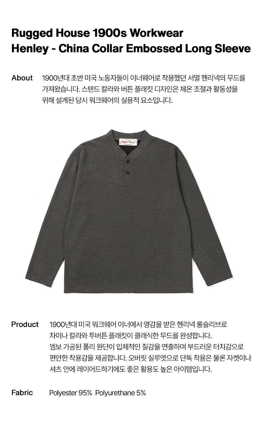 ⦁ 1900년대 초반 미국 노동자들의 언더웨어에서 영감을 받은 차이나 헨리넥 롱슬리브입니다.