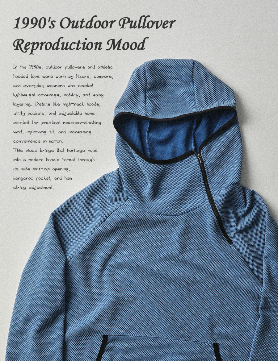 ⦁ 1990년대 아웃도어 아노락과 테크 스웻웨어 무드에서 출발한 와플 사이드 반집업 후드티.