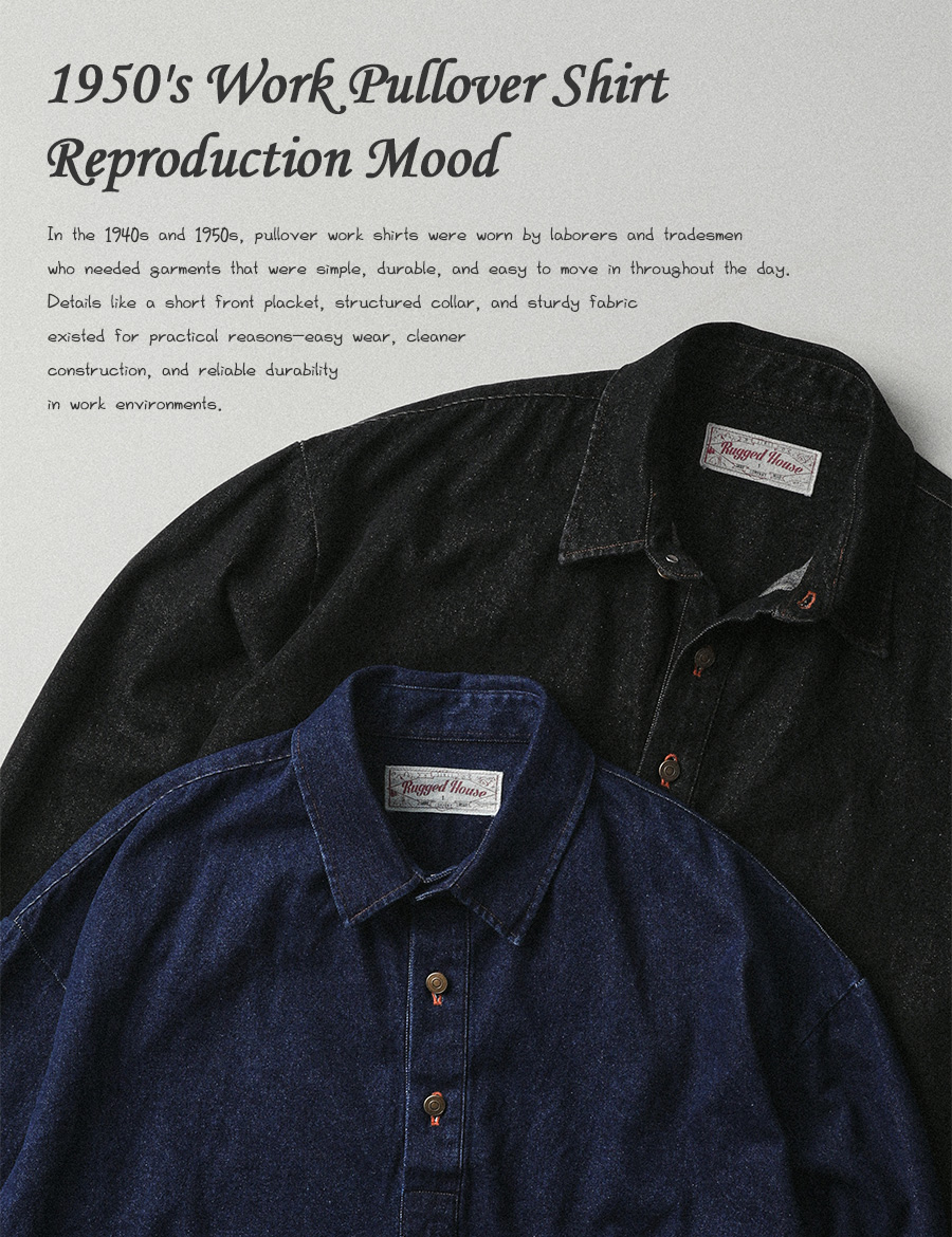 ⦁ 1950~60년대 워크웨어 풀오버 셔츠에서 출발한 하프오픈 데님 셔츠.