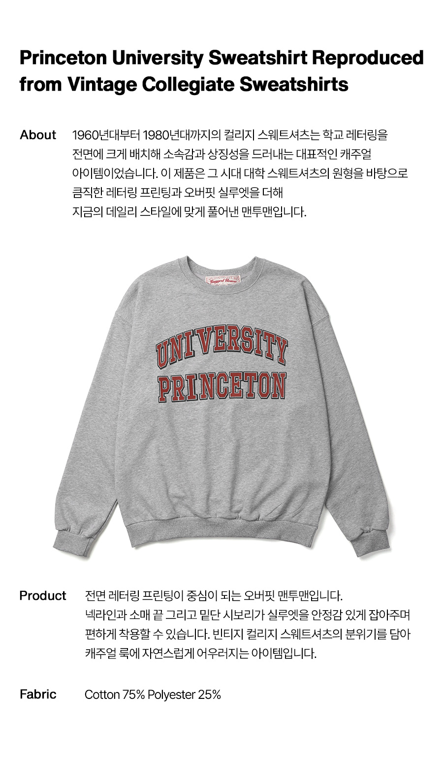 ⦁ 1960~80년대 미국 컬리지 스웨트셔츠와 캠퍼스 레터링 웨어 무드에서 출발한 프린스턴 유니버시티 맨투맨.