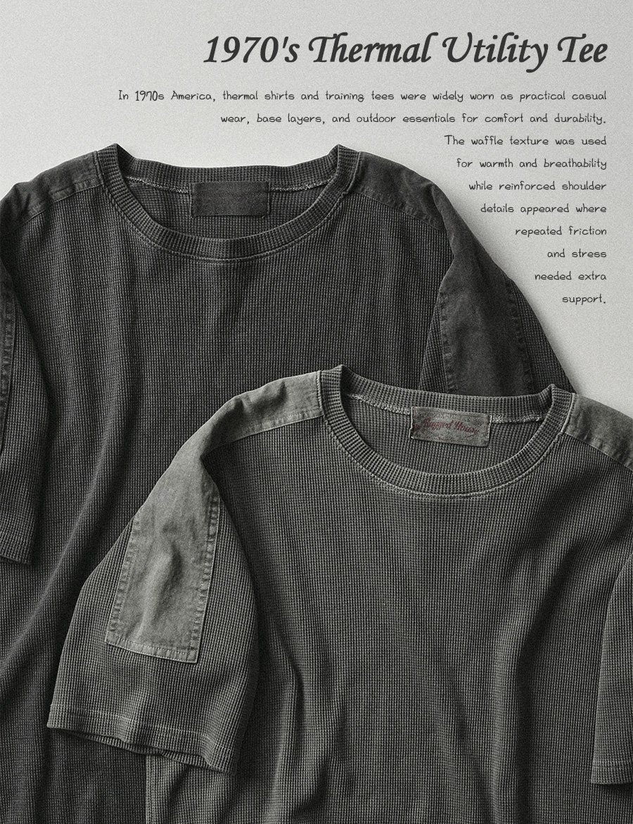 ⦁ 1960~70년대 미국 써멀 언더셔츠와 트레이닝 티셔츠 무드에서 영감을 받은 와플 반팔티입니다.