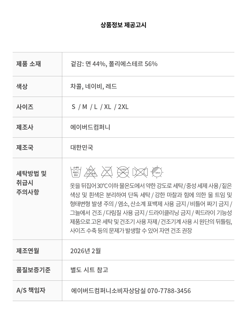 - 상품 상세란의 사이즈표는 업체 기준 측정정보 입니다.