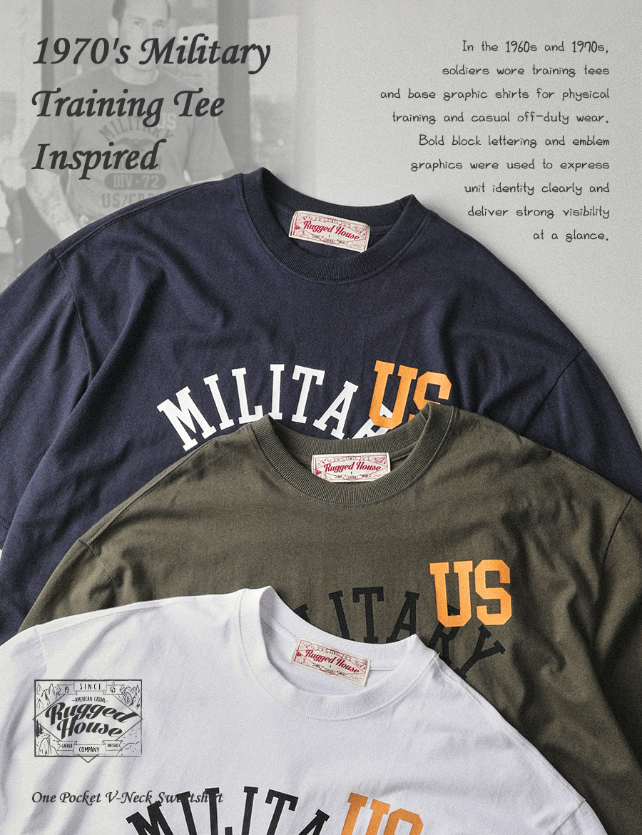 ⦁ 1960~70년대 미군 트레이닝 티셔츠와 베이스 그래픽 웨어의 무드에서 영감을 받아 풀어낸 그래픽 반팔티입니다.
