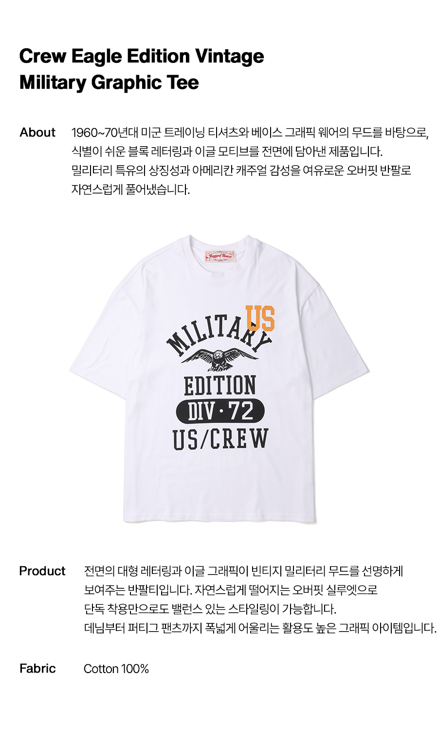 ⦁ 전면의 아치형 레터링과 이글 모티브는 당시 밀리터리 프린트 특유의 강한 식별감과 상징성을 현대적으로 재해석한 디테일입니다.