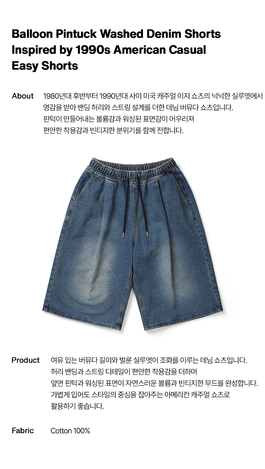 ⦁ 1990년대 미국 캐주얼과 레저웨어 무드에서 영감을 받은 벌룬 실루엣 데님 쇼츠입니다.