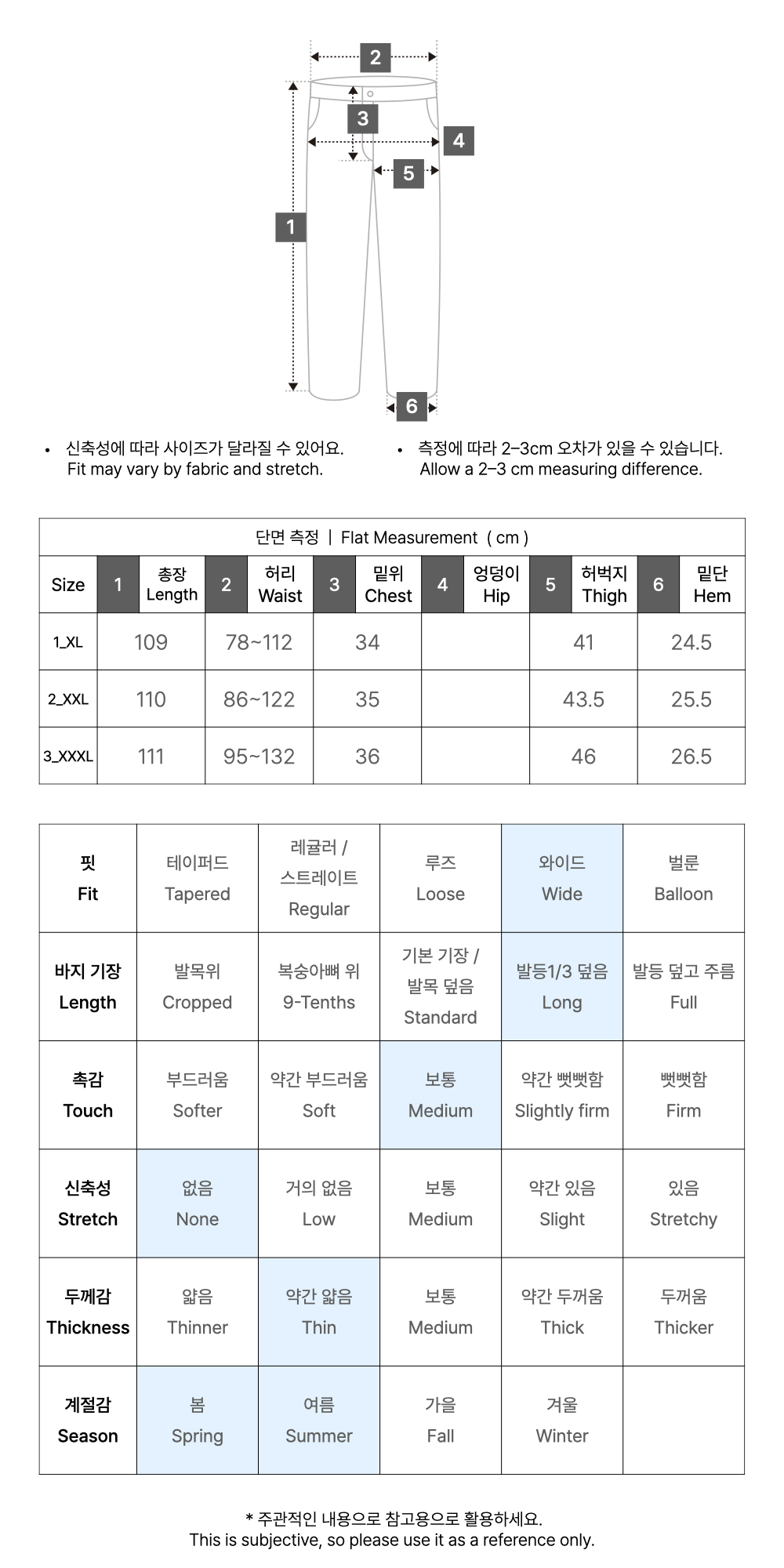 허리둘레 힙둘레 허벅지둘레 밑위 밑단둘레 총길이