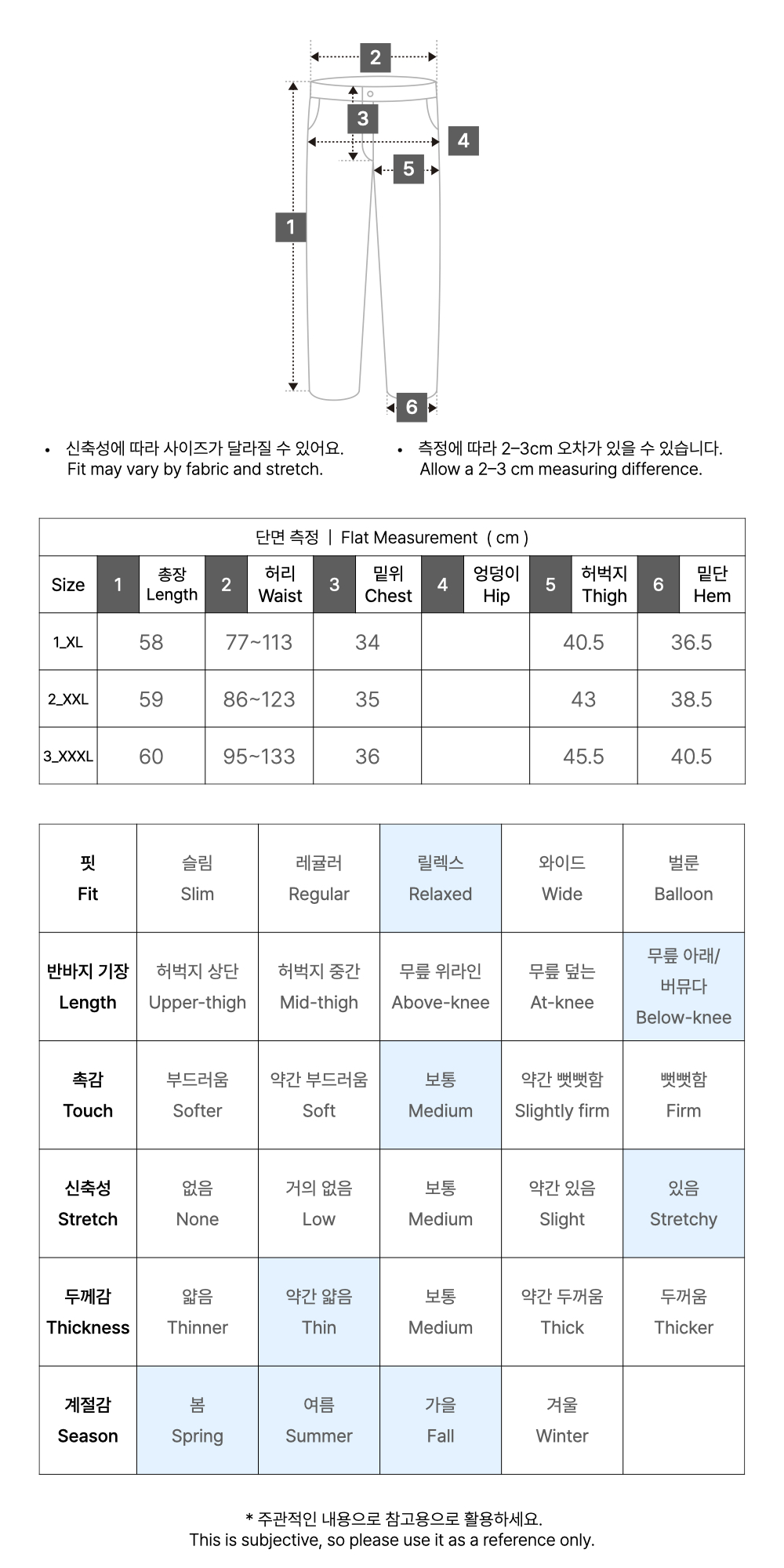 | 허리둘레 | 힙둘레 | 허벅지둘레 | 밑위 | 밑단둘레 | 총길이 | |
