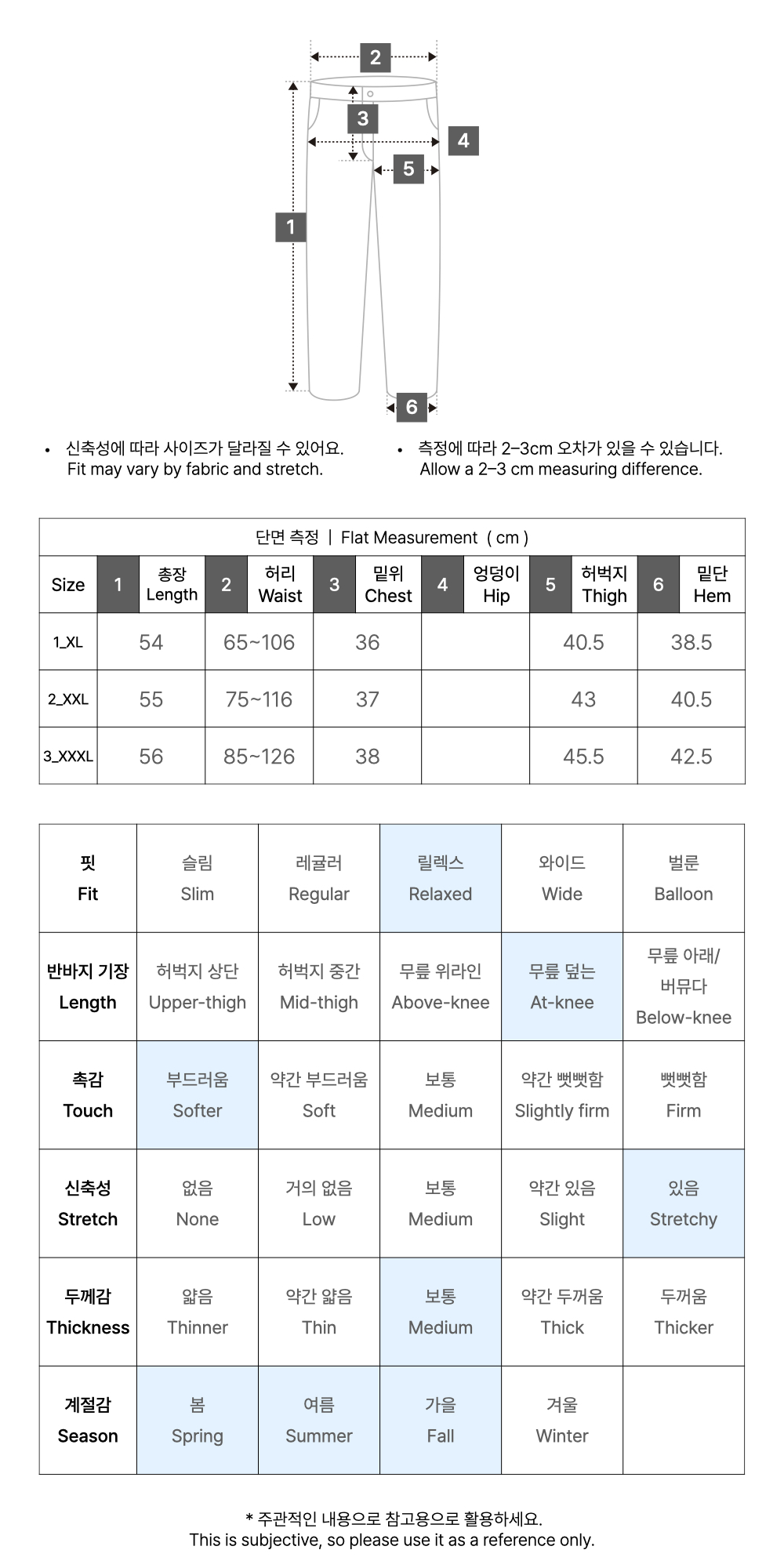 | 허리둘레 | 힙둘레 | 허벅지둘레 | 밑위 | 밑단둘레 | 총길이 | |
