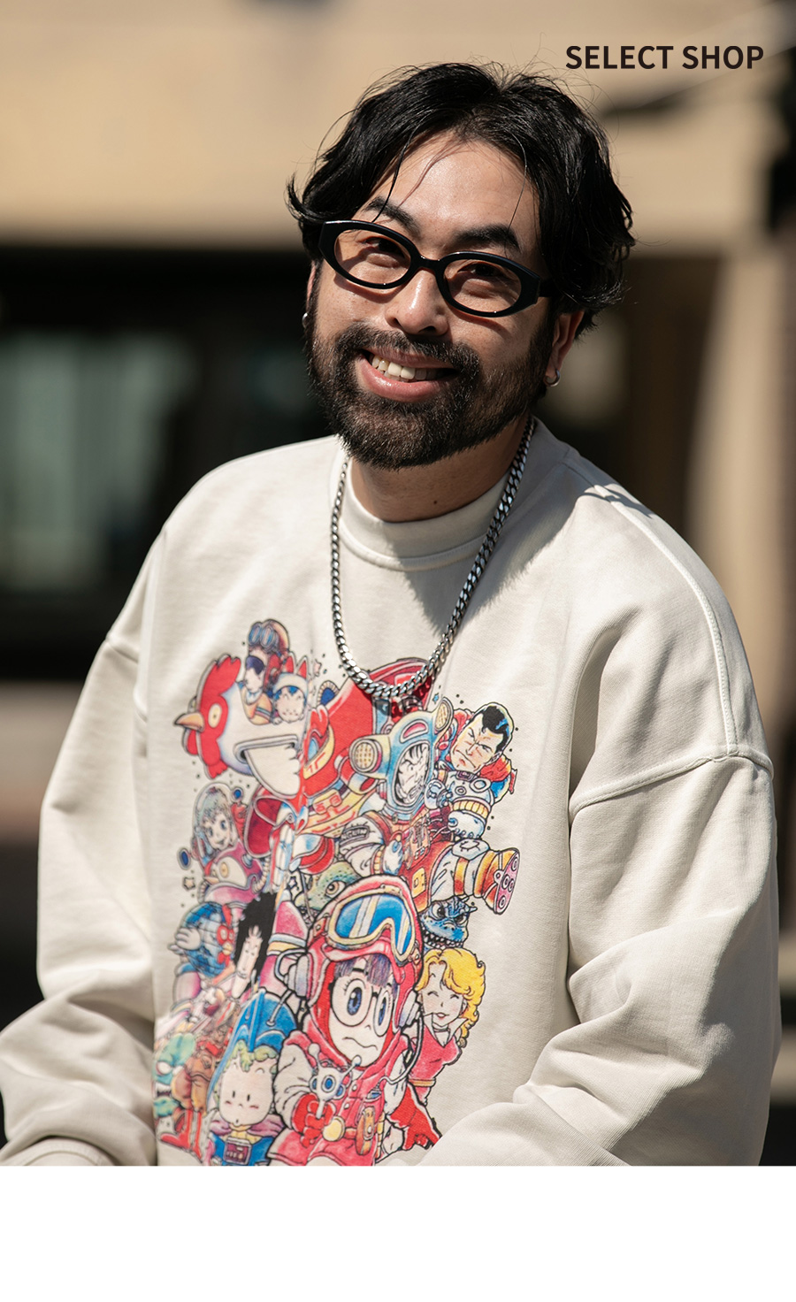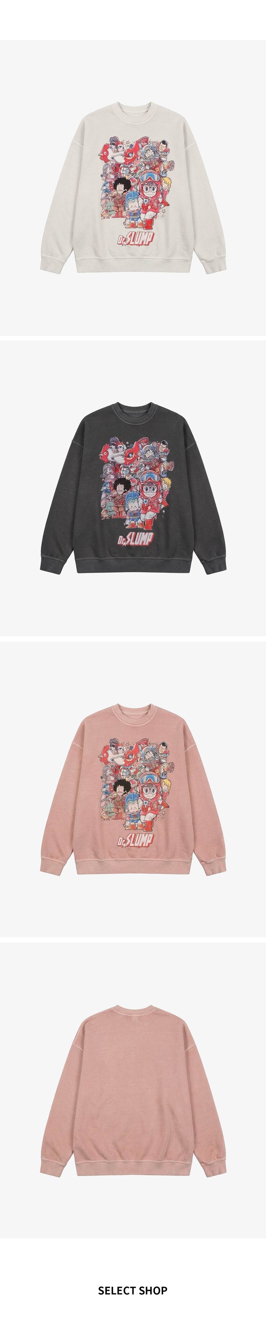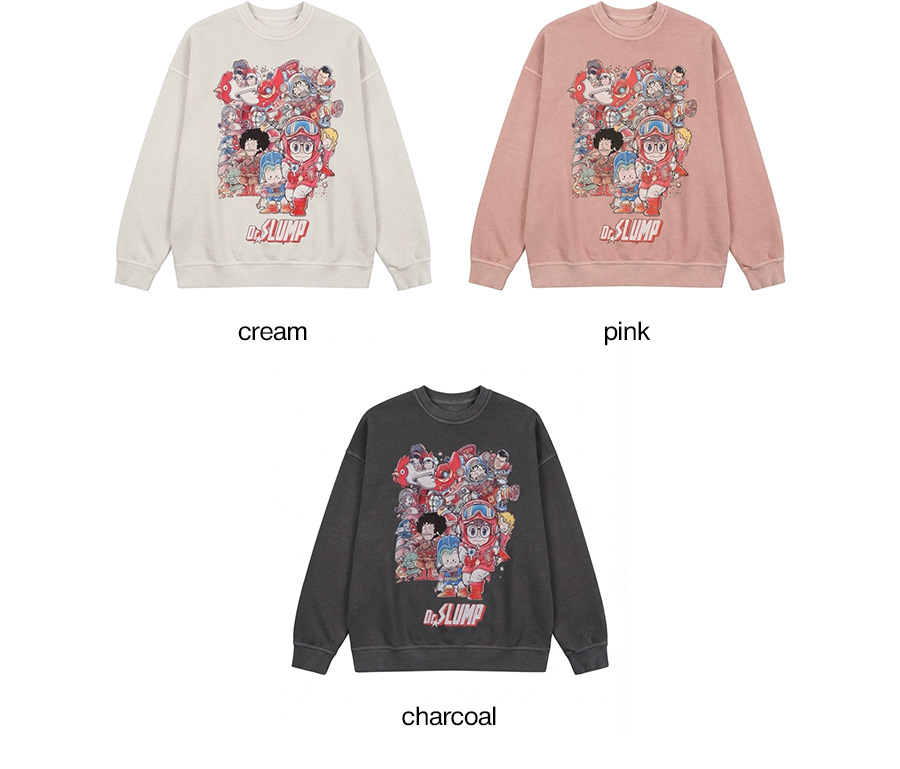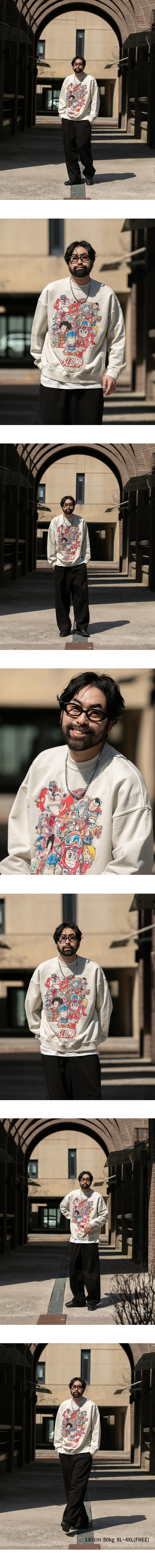 ⦁ 디자인 : 가슴 중앙에 일본 애니메이션 캐릭터들이 모인 프린트가 유니크한 포인트를 완성하는 맨투맨
