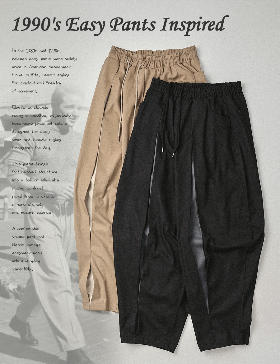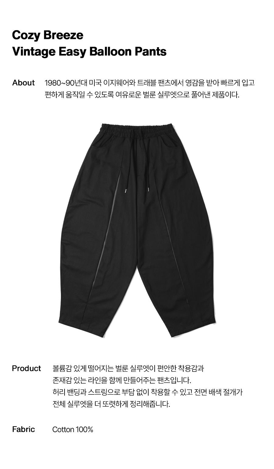 ⦁ 1980~90년대 미국 이지웨어와 리조트 캐주얼 팬츠의 무드에서 영감을 받아 풀어낸 벌룬 팬츠입니다.