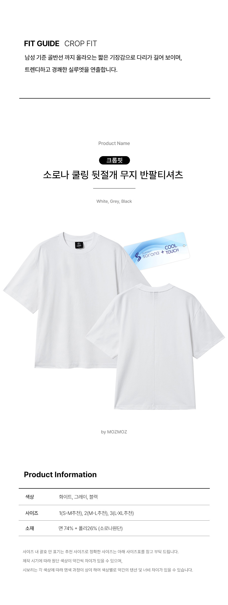 크롭핏 소로나 쿨링 기능성 뒷절개 무지 반팔티셔츠 화이트