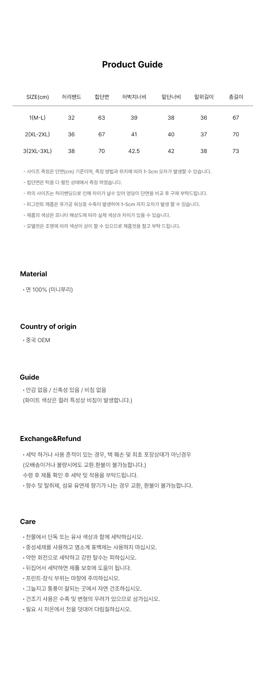 | 허리둘레 | 힙둘레 | 허벅지둘레 | 밑위 | 밑단둘레 | 총길이 | |