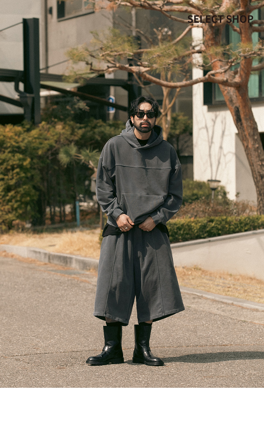 ⦁ 실루엣 : 후드티는 어깨와 품에 여유를 준 오버핏이며 반바지는 허벅지부터 여유롭게 떨어지는 와이드 핏으로 편안한 착용감 제공