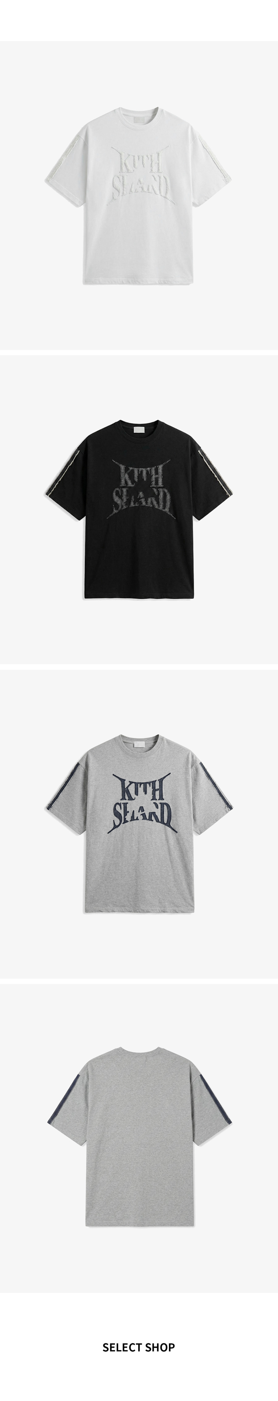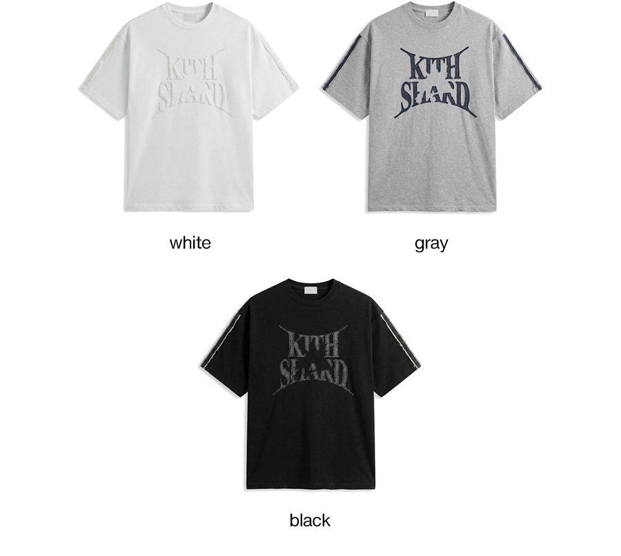 ⦁ 디자인 : 가슴 중앙에 볼드한 레터링 프린트를 배치하고 소매에 배색 라인을 적용한 반팔티
