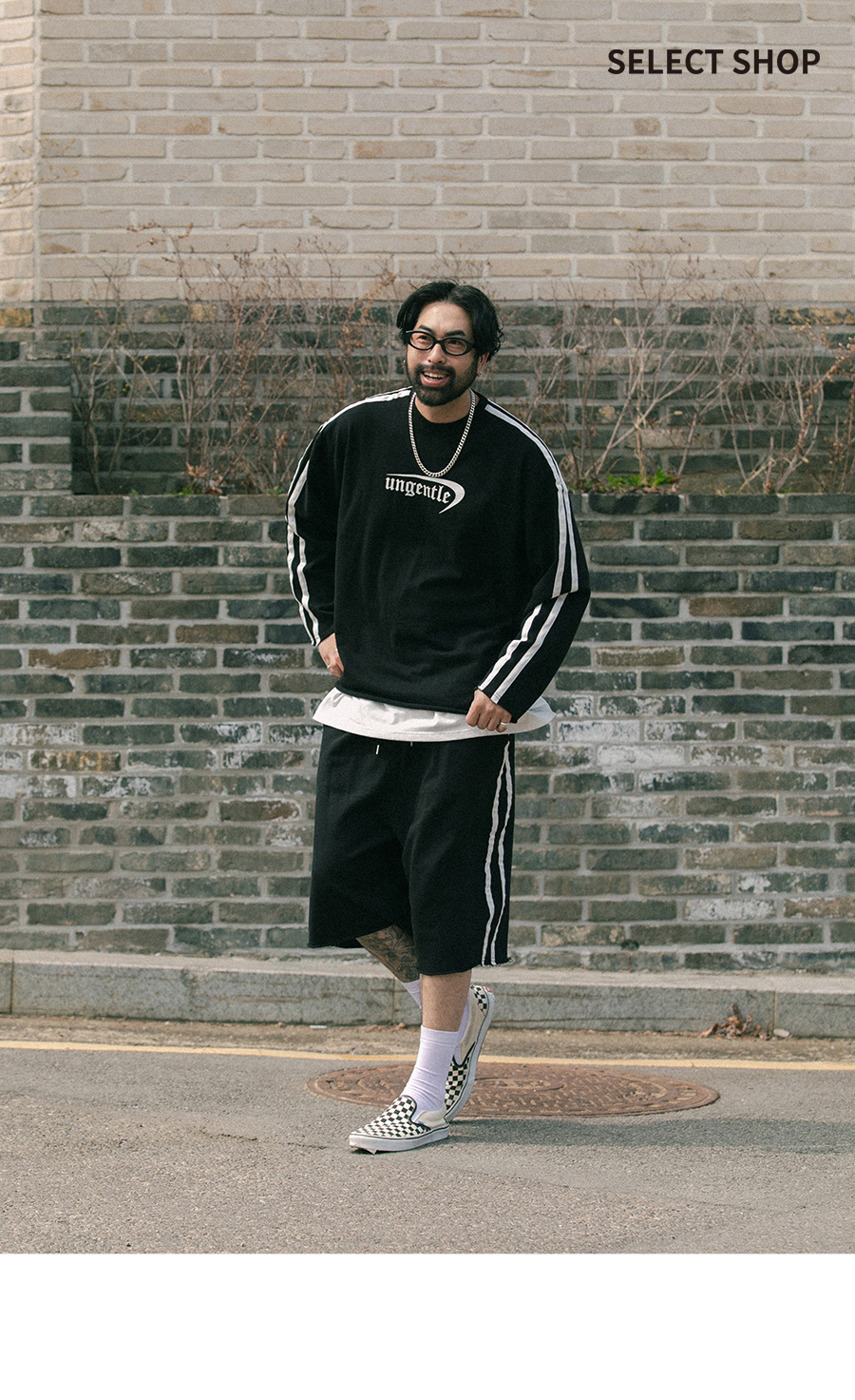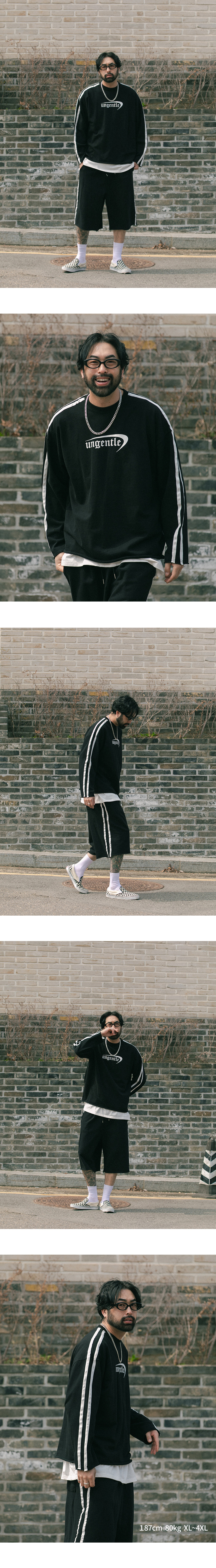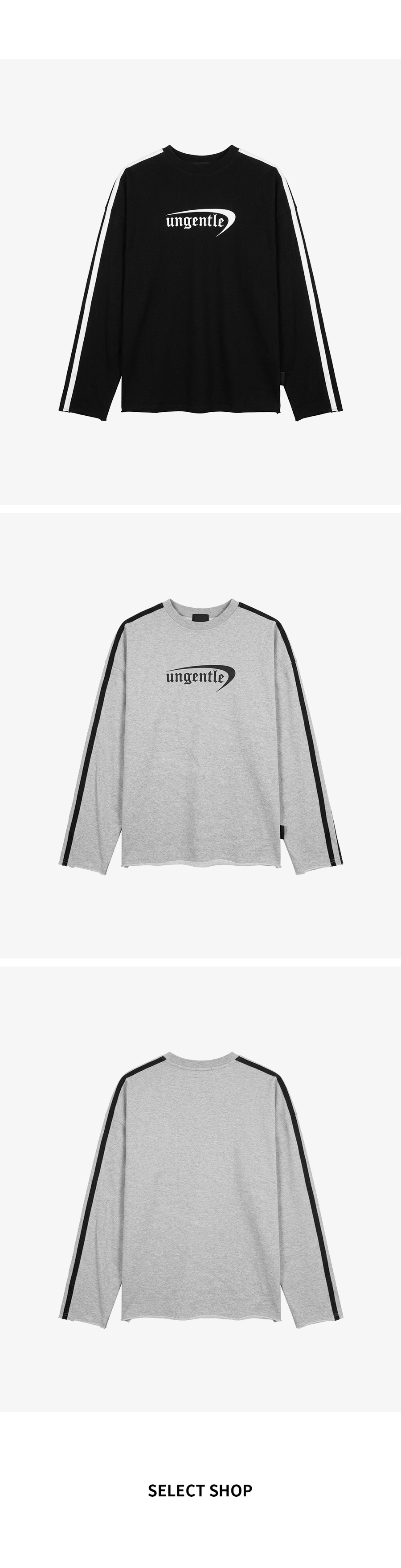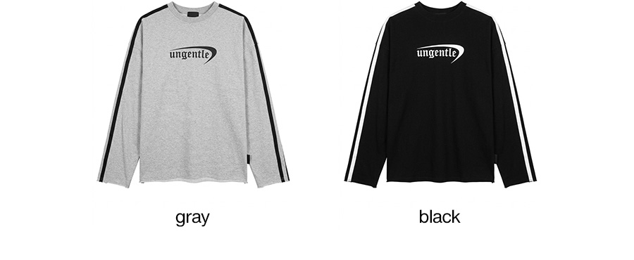 ⦁ 디자인 : 가슴 중앙에 고딕체 레터링 프린트를 배치하고 소매에 배색 테이프 라인을 적용한 롱슬리브