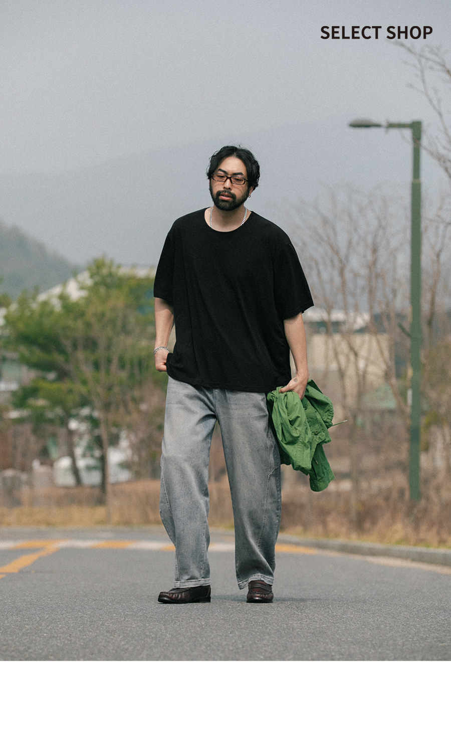 ⦁ 워싱감이 더해진 커브드 실루엣이 단조롭지 않은 아웃핏을 완성합니다.